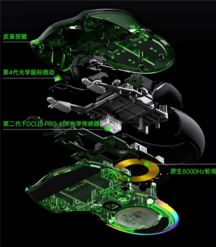 鼠方向按键和尾部王人有皮革包裹,机身三围是138.4 x 81.9×34.5mm,整只鼠标重约110g,而充满电情况下1000Hz续航为145小时,8K则只须26小时。