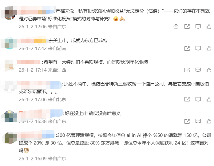 还有网友则抒发了不屑:真敢吹!批驳区则恢复:东方港湾这规模和赢利材干吊打一半上市公司;有网友示意:但愿有一天,司理们不再吹规模,而是吹经久年化事迹。